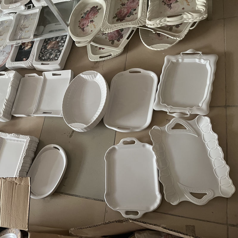 ظروف آشپزخانه و ظروف آشپزخانه، ظروف شام سرامیکی تقلید شده، ظروف میز (طبقه ها، فنجان ها، فنجان ها، ظرف ها، قاشق ها، کاسه ها و ظروف) ، ظروف ملامین.